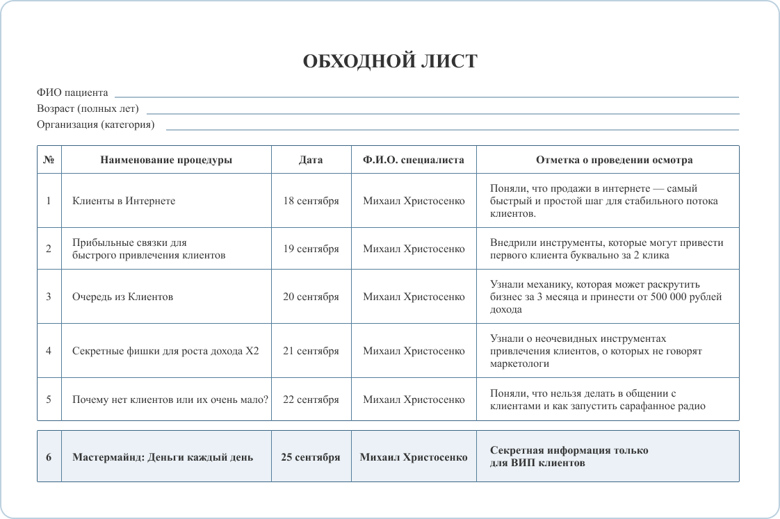Обменная карта пациента для работы на курсе